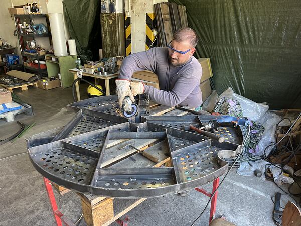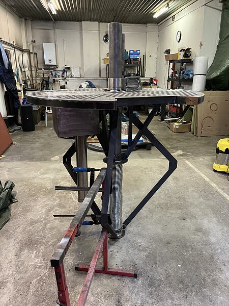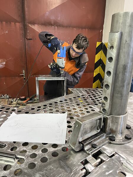 Samotná výroba začala nastudováním si archivních výkresů a obhlídkou originálních podlážek na jiných objektech opevnění. Následně se Marek pustil do překreslení některých dílů do digitálního formátu pro vypálení na laseru, mezitím Honza začal doma připravovat obojky a ramena. Milan vyráběl složitější součástky, na které byla potřeba frézka a soustruh. V září pak přišel čas na první pracovní víkend, kdy se Honza s Markem pustili do kompletace a svařování kotouče, tvořícího samotnou podlahu ve zvonu. I když se to nemusí na první pohled zdát, jen tato práce nám zabrala ve dvou vyšší desítky hodin. Po tomto zářijovém víkendu se hlavní práce na podlážce pozastavily, ale aspoň jsme připravili stupačku kotouče a svařili kompletní žebřík. Další velký pracovní víkend vyšel na ten poslední před Vánoci. Během něj se za 60 hodin práce podařilo trojici Honza, Marek a Milan podlážku v podstatě dokončit a cvičně složit.