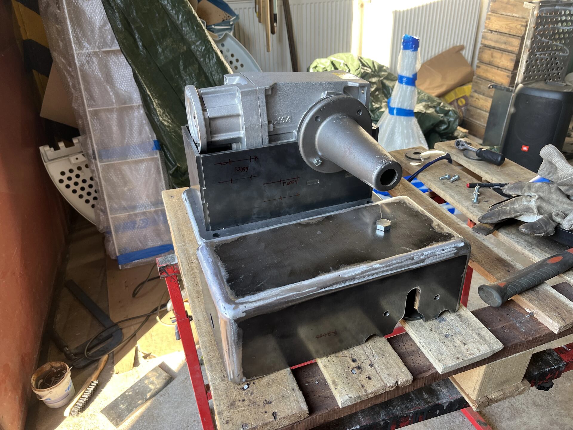Po zajištění potřebného materiálu a součástek nás čekalo mnoho hodin sváření, vrtání, broušení, vytváření závitů, pasování... Vše se nakonec zadařilo a podařilo se nám zkompletovat plně funkční stroj. Jako vždy postup práce ukazují přiložené fotografie. Pro ventilátor jsme ve strojovně objektu vybetonovali podstavec a na něj ho uložili. Ještě na nás na něm čeká ladění několika detailů a zejména napojení na vzduchotechniku. Už teď ale tvoří velmi zajímavý a plně funkční prvek vybavení.